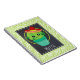 A personalised spiral notebook with a cute illustration of a cactus, with big kawaii eyes, wearing a red sombrero. The background is a chalkboard image layered over top a pattern of lime green swirls.