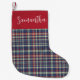 This design features a cute simple stylish calligraphy script Christmas stocking with a red and navy blue plaid pattern, a rustic farmhouse country whimsical, minimalist minimal classic classy, an elegance elegant vintage rustic style, old fashioned timeless holiday design, winter Christmas holiday home decor, a custom customised personalised name, Christmas holiday custom gift idea, a creative simplistic Christmas design