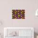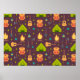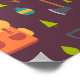 A poster with a fun camping themed pattern. Set on a reddish brown background. Elements in the pattern include a campfire, a tent,. a guitar, a shovel and backpack.