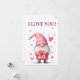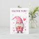 cute card with a cartoon pink gnome in love