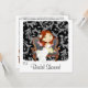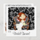This cute bridal shower suite has a fun wallpaper graphic on a white background. There are several choices of wallpaper to set off the precious bride illustration. Sitting on either a black and grey or purple striped couch is a sweet illustration of an auburn or red headed bride in her long white dress.