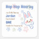 Hop, Hop, Hooray! Your little bunny is turning ONE! This adorable birthday Thank you sticker features a playful cartoon bunny peeking from the corner, surrounded by twinkling funny stars on a soft pastel background. With a fun mix of script and serif fonts, the text reads, “Our little bunny [Name] is turning one!”—making it the perfect way to celebrate this special milestone. Easily customise all the party details for a truly personal touch!