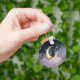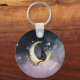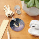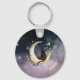 A cute cartoon black cat sits happily on a crescent moon in a starry night sky. Perfect for cat lovers.