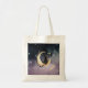 A cute cartoon black cat sits happily on a crescent moon in a starry night sky. Perfect for cat lovers.
