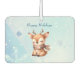 A cute cartoon deer wearing a plaid scarf sits happily amongst snowflakes. The words “Happy Holidays” can be easily changed to any message you desire.