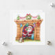 Vintage illustration cartoon Christmas holidays clipart design with Santa Claus coming down the chimney. The fireplace mantle is decorated with stockings, a wreath and a banner that reads Welcome Santa. A mouse wearing a fuzzy red hat is waiting for Santa.