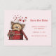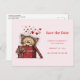 Save the date postcard with a cute drawing of a little kitten poking its head out of a gift box.