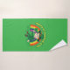 Bath Towel with an Illustration of a cute smiling leprechaun wearing a green suit, a top hat while holding a shamrock leaf, with a colourful rainbow in the background and text saying "Happy St. Patrick's Day"