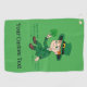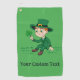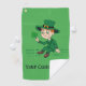 Golf Towel with an Illustration of a cute smiling leprechaun wearing a green suit, a top hat while holding a shamrock leaf