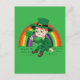 Postcard with an Illustration of a cute smiling leprechaun wearing a green suit, a top hat while holding a shamrock leaf, with a colourful rainbow in the background