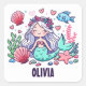 Cute cartoon mermaid in an under the seat scene featuring shells, coral and fish. Colourful, bright and fun with a template below this whimsical illustration to add your name to personalise.