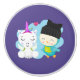 Ceramic door knob with a whimsical image of a unicorn and bird. This pair is happily smiling while hanging out together. A little heart hovers above their head. Unicorn is white with angel wings and a pink horn. The bird is a greenish blue colour wearing a black toque with black kitty cat with ears. A blue cloud placed behind these happy best friends.