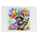 Sweet racoon holding a birthday gift surrounded by birthday balloons in blue, yellow, green, purple and pink. Personalised gift bag.