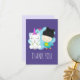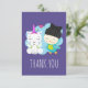 Thank you card with a whimsical image of a unicorn and bird. This pair is happily smiling while hanging out together. A little heart hovers above their head. Unicorn is white with angel wings and a pink horn. The bird is a greenish blue colour wearing a black toque with black kitty cat with ears. A blue cloud placed behind these happy best friends.