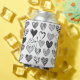 Playful cat tugging at a heart shaped balloon surrounded by different patterned hearts in black and white.