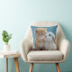 This is a pillow cushion. It has a cat and a rabbit kissing each other.