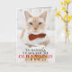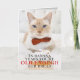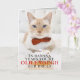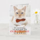 Handsome orange and white kitty in bright red bowtie with banana bread cupcake and a snarky birthday message.