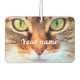 A cute cat face with big green and yellow cat eyes in focus, on an air freshener, with your custom name on it.