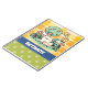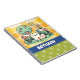 An adorable notebook of a cute doodle style art cartoon kitty cat sitting peacefully in a beautiful garden. The cat is a pale cream colour with orange stripes along it's body and tail. She is resting on green grass surrounded by pink, blue and yellow flowers. In the background is a green tree with heart shaped fruit and a happy yellow sun against a pale blue sky. This whimsical illustration would suit anyone of any age especially children and cat lovers. The background to the illustration is a yellow check pattern. Below the illustration is a blue band with white lettering to add your name or other text to personalise. Below is a green space with light green paw prints.