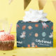 Add a fun touch to your birthday party or other celebration with this cute cat in space wrapping paper. Gift wrap features an orange cat flying in a cardboard box in space. There's also a rocket ship, the planets Earth, Saturn, and Jupiter, a satellite, meteorites, and a flag with a paw print. Add your pet's first name for a custom touch.