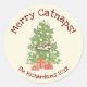 The Cute Cat on Christmas Tree Merry Catnaps! Classic Round Sticker is a sweet and festive touch for the holidays. It features an adorable orange cat peacefully sleeping on a Christmas tree, decorated with yellow ornaments and two wrapped presents underneath. Above the illustration, the cheerful phrase "Merry Catnaps!" is displayed in festive red letters, while below there’s space to add your family name and year for a personalised holiday touch. With its cream background and red lettering, this sticker is perfect for sealing envelopes, gift wrapping, party favours, and holiday mailings.