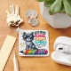 A cheerful design featuring a grey cat wearing sunglasses seated on a colourful pencil.