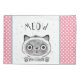 This reversible pillowcase coordinates with the collection below and has an aqua blue and white polka dot pattern on the front side with a pink and white polka dot pattern on the back. Both sides have a large white section trimmed in pink or blue with a large illustrated cat face in gray and white. The cat on the front has large blue eyes and the cat on the backside has white eyes. There is also a pattern of small grey dots surrounding the cat faces and each has the word MEOW above the head in black and a pair pf paws in grey at the bottom. Email niteowlstudio@gmail.com with any change request or to add something to the collection. Please watch your spam/junk folder for my reply email.