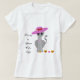 Fashion T-Shirt with a cute cat with hat and golden balls. The lovely grey cat is wearing a violet sun hat. The text: "Living a Great Cat's Life" can be personalised.