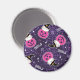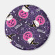 A magnet with an adorable Halloween themed pattern. Cats in witches hats, sitting on pink pumpkins with purple cobwebs in the background.