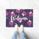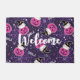 A welcome doormat with an adorable Halloween themed pattern. Cats in witches hats, sitting on pink pumpkins with purple cobwebs in the background.