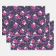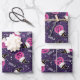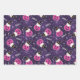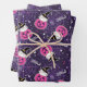 Wrapping paper sheets with an adorable Halloween themed pattern. Cats in witches hats, sitting on pink pumpkins with purple cobwebs in the background.