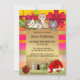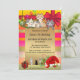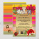 A cute colourful child birthday party invitation featuring kittens and festive ornaments on a festive striped background. This invitation is perfect for a Christmas party for children as well as a December birthday celebration.
