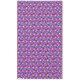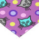 A 60” x 104” tablecloth featuring a cute, colourful pattern design of grey and teal cats against a purple violet background with multicolored polka dot accents.