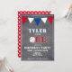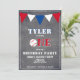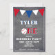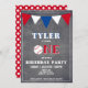 Cute Chalkboard Baseball 1st Birthday Invitation // Cute baseball birthday party card for the 1st birthday. The design has a large baseball and bunting flags in red, white and blue colours on the chalkboard background. Personalise this birthday invite with a child`s name and a photo and personalise all the data on the invitation. Great as a boy 1st birthday party invitation.