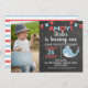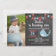 This cute boy's chalkboard birthday party invitation features a whale, some bunting flags, a two color heading and faint gold dots on a chalkboard background. This is a cute way way to invite guests to your little boy's whale themed birthday party.