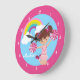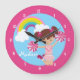 Pretty personalised hot pink cheerleading wall clock with a brunette girl jumping with pom poms in front of a beautiful rainbow. Customise with your cheer captain or head cheerleader name. I love little cheerleader room decor for kids. Images by www.prettygrafik.com