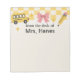 Brighten up your classroom or office with these trendy teacher sticky notes! Featuring a playful yellow chequerboard top, pink bow, cheerful school bus, pencils, and a smiling flower, this notepad is both functional and fun. The design includes “From the desk of [Your Name]” for a personalised touch while leaving plenty of white space for reminders, notes to students, or quick memos. A perfect teacher appreciation gift, back-to-school essential, or custom classroom accessory—sure to make writing notes extra cute and professional!