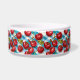 A watercolor ai illustration pattern of shiny red cherries, sage green foliage and blue chequered plaid pet bowl.