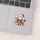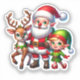 Cute Christmas sticker with a Santa, Elf and Reindeer in a chibi 3D style. Snowflake background.