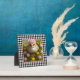 Pretty tabletop plaque features a digital art painting of a baby chick among pink and yellow flowers with black and white gingham check border background.
