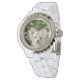 A young long-haired cream white coloured Chihuahua dog sitting in a flowering garden, photo taken by Katho Menden. This rhinestone watch for women with dial-plate is a gift idea for dog lovers.
