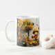 Mug featuring children going back to school in a fall landscape with flowers and butterflies. A cute mug, nice for children as well as adults.