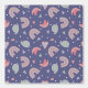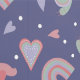 vector illustration in the form of a seamless pattern in a cute style with pastel rainbow, hearts, and birds, the design incorporates pink, purple, blue, green, and lavender colours, the background colour is navy blue.