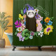 A cute chocolate sable ferret sitting amongst colourful flowers in a backdrop of dark green