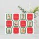 Cute Christmas themed images in individual green squares alternating with red squares that each have different holiday wishes. The images are a snowman, a candy cane striped stocking, a Santa Claus, a reindeer, a decorated Christmas tree and a gingerbread man cookie. All of the holiday wishes can be easily changed to any greeting you prefer. The text on the back can also be easily changed or deleted if you want to handwrite your message.