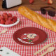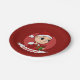 Paper plates with an illustration of a cute smiling happy baby girl or boy, the baby is wearing red and white clothes and holding a present; with editable text template for your name or message, Christmas holidays design with a red background