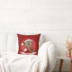 Throw pillow with an illustration of a cute smiling happy black baby girl or boy, the baby is wearing red and white clothes and holding a present; with editable text template for your name or message, Christmas holidays design with a red background