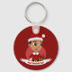Keychain with an illustration of a cute smiling happy boy, he is wearing red and white Santa Claus costume and holding a present; with editable text template for your name or message, Christmas holidays design with a red background