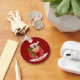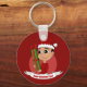 Keychain with an illustration of a cute smiling happy toddler boy, he is wearing red and white Santa Claus costume and holding a present; with editable text template for your name or message, Christmas holidays design with a red background