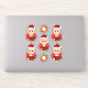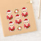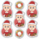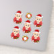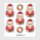 Set of seven cut-vinyl stickers with an illustration of a cute little happy smiling boy with short ginger hair, who is dressed in Christmas clothes and is wearing a red Santa Claus hat, on a red background; five stickers of the boy and two stickers with a Christmas wreath